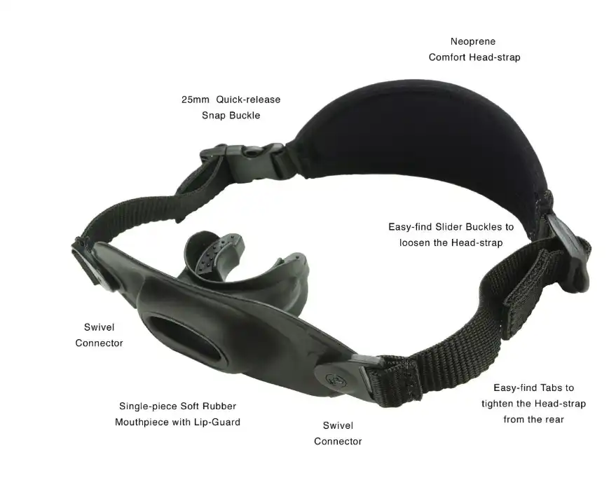 The swivel hinges connecting the mouthpiece to the head-strap allow it to be worn at different angles - with the neoprene strap in your preferred position - without scrunching or distorting the mouthpiece.