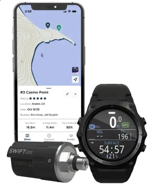 Every Shearwater air integrated dive computer can lock in your dive site location coordinates with the Swift GPS. Get more than the benefits of air integration when you capture your dive\'s entry andexit points, and add maps to your Dive Shearwater log.